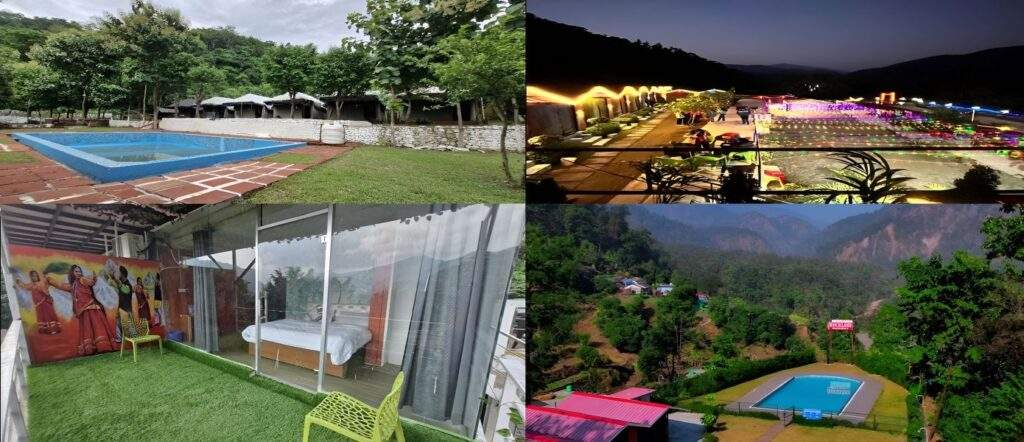 1. Vatika Retreat Mohanchatti – The Resort is located in Neelkanth Temple Road Mohanchatti, it has a land area of 09 acres approximately, surrounded by the forest from all sides with a 360 degree view of mountains from every side of resort. This resort is a luxury forest camp with 26 Swiss Luxury tents with cooler facility & 15 Air-conditioner rooms with all modern facilities. You can easily reach here by coming on the Neelkanth temple road. Luxury Camping in Vatika Retreat offers Private Parking, Lush green gardens, Open conference hall, open lawn for Yoga sessions. Vatika Retreat offers a multi cuisine Restaurant where you can have your delicious & fresh meals. Enjoy your comfortable stay in Swiss Camps/AC Rooms as per your budget with private bathrooms, neat & clean blankets, 24 hour power-backup,   Air-conditioner, Cooler, Heaters (available only in AC rooms) etc… The resort also offers in-house Activities like – Swimming Pool, Rain Dance, DJ Night, Rope Adventure Activities (Burmah Bridge, Commando Net, Tarzan Swing, Balance Walk, V Bridge). Apart from these activities out-door games like – Soft Ball Cricket, Badminton, Volleyball, Carom, Chess, Ludo, Playing Cards, UNO, Tug-of-war. After enjoying all these activities & sports games you can also go for a trekking to the River (Heul River) that is only 20 minutes away from the resort, where we have our own private beach where you can enjoy you day picnic by making Maggie yourself near to the river bank, playing music, dance etc….